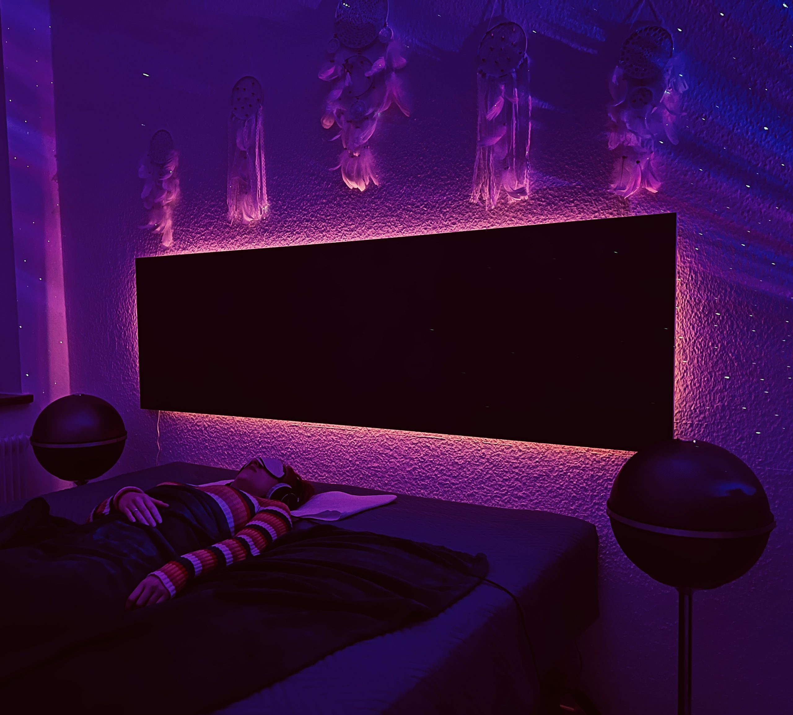 Im gesamten Raum bewegen sich Lichtimpulse langsam und rhythmisch – wie der visuelle Puls deiner Reise.